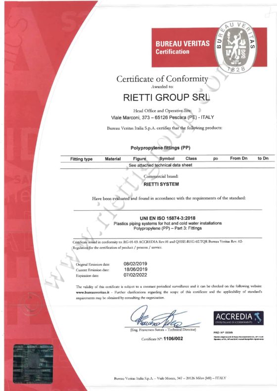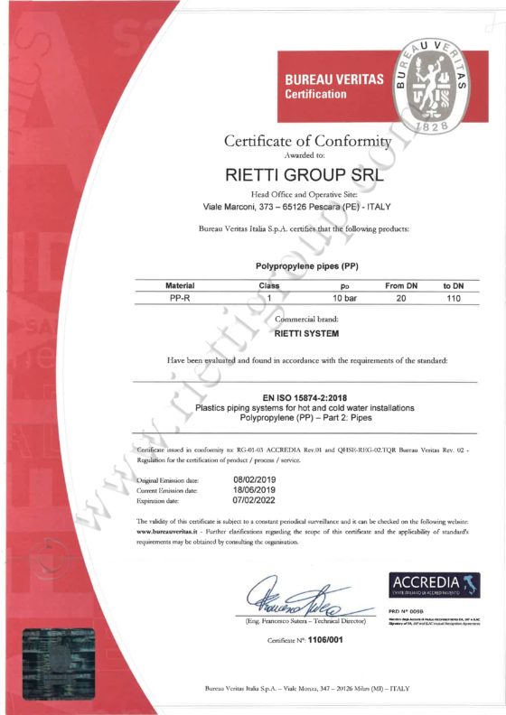 Siamo lieti di annunciare che il nostro sistema PP-R ha ottenuto la certificazione dall’ente internazionale BUREAU VERITAS. Tubazioni e raccordi di nostra produzione sono stati analizzati e testati, risultando essere pienamente conformi allo standard internazionale UNI EN ISO 15874:2013 – Sistemi di tubazioni di materie plastiche per le installazioni di acqua calda e fredda, Polipropilene (PP).